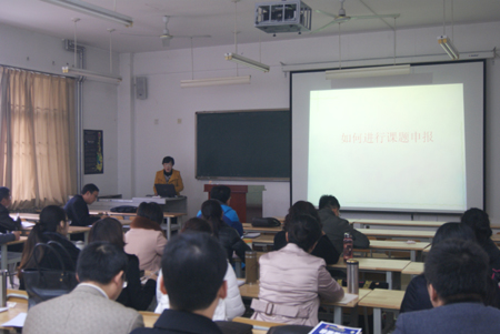 马银华教授根据多年的科研工作管理经验,结合自身成功申报课题经验,交流了课题申报的途径、注意事项和体会。学术报告围绕着课题申报的渠道和类型、如何撰写申报书、课题申报应注意的问题三个主题展开。马银华博士深入浅出地跟与会教师介绍了国家级课题、省部级课题、厅局级课题的类别、申报途径、经费来源等,并以自身申报的2014年度教育部人文社会科学研究项目“乡村儿童精神生活的三十年变迁研究——基于鲁南四村的历史人类学考察”为例,对申报课题过程中如何理清思路进行了精彩详细的阐述。